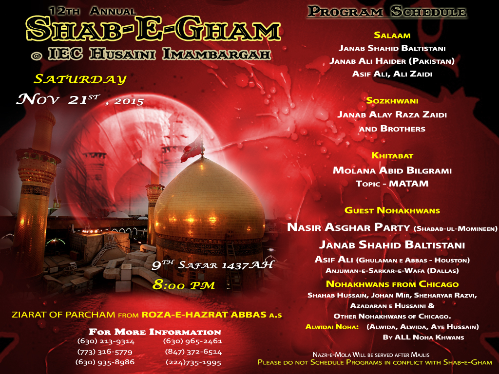 Majlis-e-Aza Satuday Nov 7th, 2015. at the residence of Br. Vizarat Gohar 1N335 Farwell St, Wheaton. IL. @ 10:00 PM.